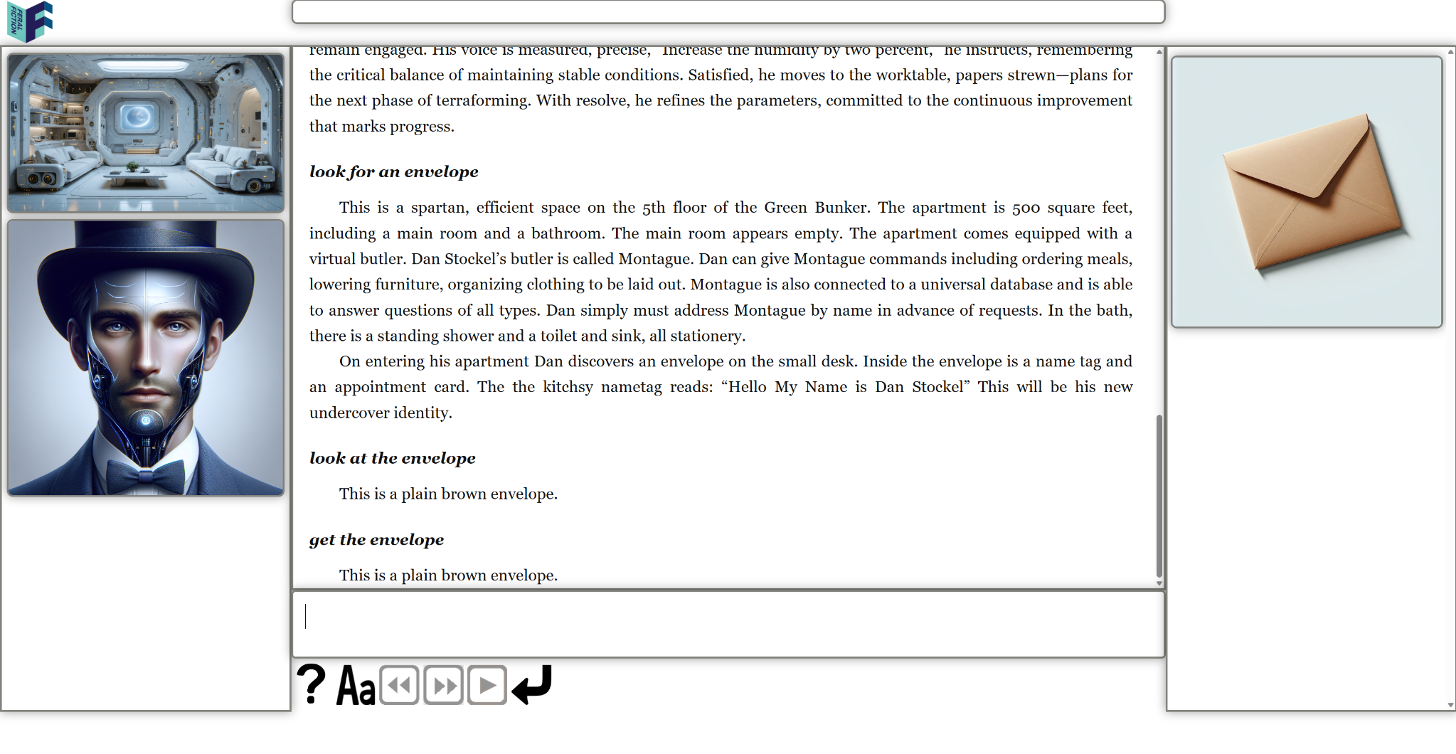 Feral Fiction lets you talk with the characters in the story. This can be through typed dialog, or voice (see next section). Here's how typed dialog works: